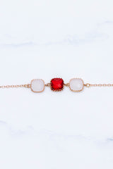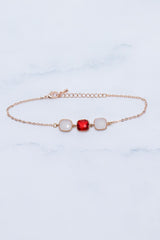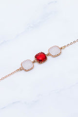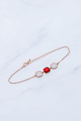Dieses rosegoldene Armband mit zwei weißen und einem roten Stein, eignet sich perfekt für jeden Tag.