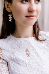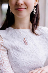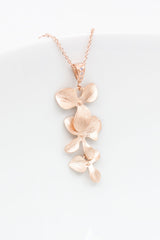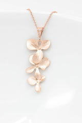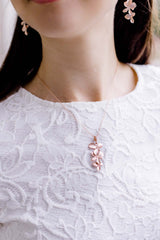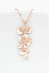 Die rosevergoldete Halskette zieren drei zarte Blüten, die an einer mit Zirkoniasteinen besetzten Schlaufe befestigt sind.