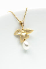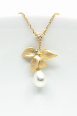 Die tropfenförmige Perle ist an einer zarten Blüte befestigt, durch den sich eine feine vergoldete Kette zieht.