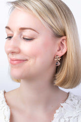 Diese rosegoldenen Ohrringe sind hochwertig gefertigt und mit funkelnden Steinen und filigranen Blumen verziert. Das zeitlose Design und die edle Verarbeitung machen diese Ohrringe zu einem unverzichtbaren Accessoire, das in keiner Schmucksammlung fehlen sollte. Ob im bei festlichen Anlässen, wie einer Hochzeit, diese Ohrringe verleihen jedem Outfit das gewisse Etwas und unterstreichen die Persönlichkeit der Trägerin. Die Kombination aus Rosegold, pfirsichfarbenen Steinen und Blumen verleiht diesen Ohrringen eine besondere Eleganz und Schönheit. Mit diesen Ohrringen wirst Du garantiert bewundernde Blicke auf Dich ziehen.