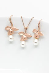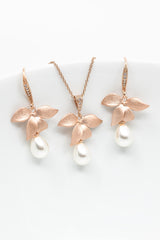 Wunderschöne rosegoldene Ohrhänger, mit zarten Blüten und kleinen ovalen Perlen. In die Ohrhaken wurden vier kleine Zirkoniasteine eingefasst, die sie so zu einem besonderen Blickfang machen. Die rosegoldene Kette ziert eine tropfenförmige Perle, die an einer zarten Blüte befestigt ist.