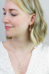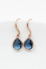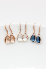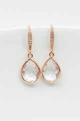 Wunderschöne rosegoldene Ohrringe mit Schmucksteinen und Zirkonia besetzten Ohrhaken. Ihre Tropfenform verleiht ihnen ein zeitloses Aussehen. Erhältlich in den Farben Kristall, Pfirsich oder Blau.