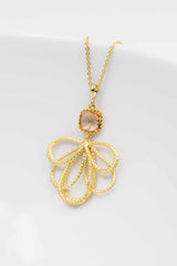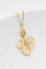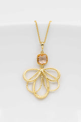 Wunderschöne vergoldete Kette, mit einem kleinen pfirsichfarbenen Schmuckstein. Den unteren Teil des Anhängers ziert ein fächerartiger Blumenanhänger.
