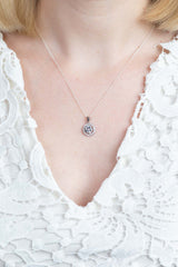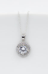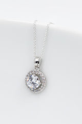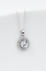 Der lange funkelnde Kristallanhänger umrahmt von zarten Zirkoniasteinen ist an einer feinen silbernen Kette befestigt und bezaubert durch sein elegantes Design.