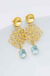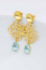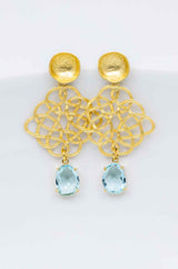 Diese vergoldeten Ohrringe bezaubern durch ihren orientalischen Look. An den kleinen halben Schalen sind Stecker befestigt, damit die Ohrringe fest am Ohr sitzen. Die zarten goldenen Ornamente zieren aquamarinfarbene Steine, die mit zahlreichen Facetten gearbeitet sind.
