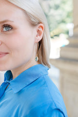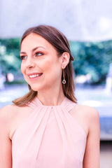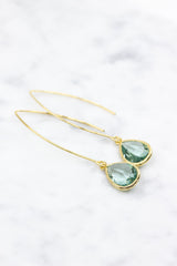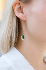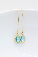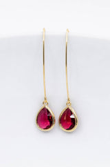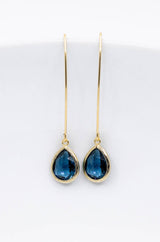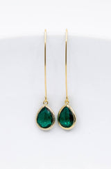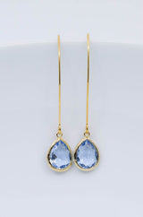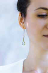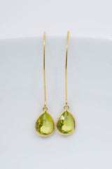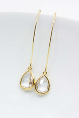 Lange vergoldete Ohrringe mit tropfenförmigen Kristallen.