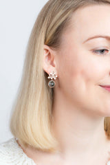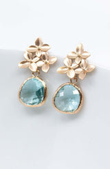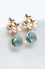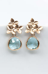 An den rosevergoldeten Ohrsteckern sind drei zarte kleine Blüten befestigt. Die aquamarinfarbenen Schmucksteine geben den Ohrringen ein sehr elegantes Aussehen.
