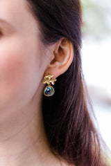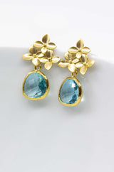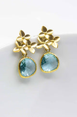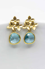 An den vergoldeten Ohrsteckern sind drei zarte kleine Blüten befestigt. Die aquamarinfarbenen Schmucksteine geben den Ohrringen ein sehr elegantes Aussehen.