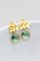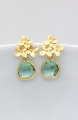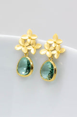 An den vergoldeten Ohrsteckern sind drei zarte kleine Blüten befestigt. Die erinitefarbenen Schmucksteine geben den Ohrringen ein sehr elegantes Aussehen.