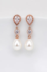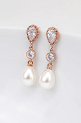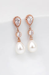 Diese zeitlosen langen Perlenohrringe kannst Du perfekt zu vielen Brautoutfits tragen. Die rosevergoldeten Ohrstecker bezaubern mit ihren tropfenförmigen Perlen durch pure Eleganz.