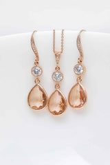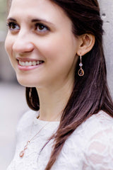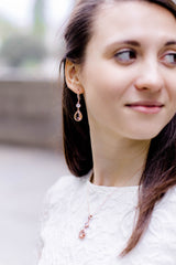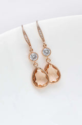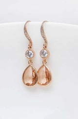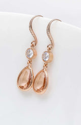 Wunderschöne rosegoldene Ohrringe mit pfirsichfarbenen Schmucksteinen und einem Zirkoniastein. Ihre Tropfenform verleiht ihnen ein zeitloses Aussehen.