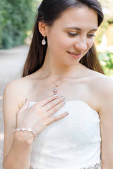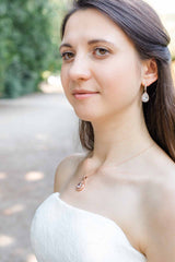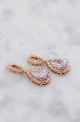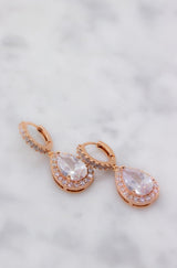 Diese rosevergoldeten Ohrringe kannst Du perfekt zu vielen Brautoutfits tragen. Die zeitlosen Ohrringe bezaubern mit ihren tropfenförmigen Kristall durch pure Eleganz. Die zarten Brisurenverschlüsse, mit funkelnden kleinen Zirkoniasteinen, machen die Ohrringe zu einem absoluten Blickfang!