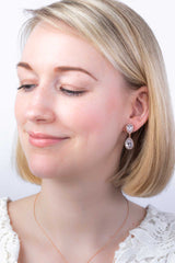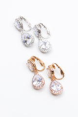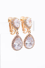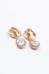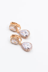 Rosegoldene Ohrringe mit Clipverschluss. Die Zirkonia besetzten Schmucksteinen, in Tropfenform, verleihen ihnen ein zeitloses Aussehen.