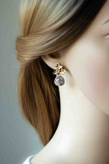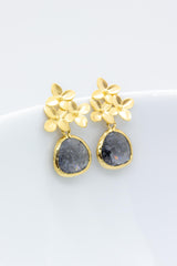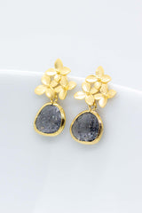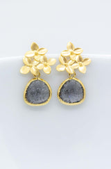 An den vergoldeten Ohrsteckern sind drei zarte kleine Blüten befestigt. Die grauen, gebrochenen Schmucksteine verleihen den Ohrringen das ganz besondere Etwas.