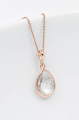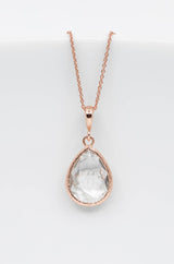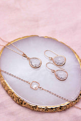Dieses rosegoldene Schmuckset bezaubert durch seine Schlichtheit. Die Tropfenform der rosegoldenen Ohrhänger verleiht ihnen ein zeitloses Aussehen. Der Kristallanhänger ist an einer feinen rosevergoldeten Kette befestigt. Das Set wird durch das zarte Armband mit dem passenden Schmuckstein komplettiert.