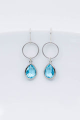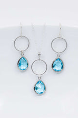 Dieses silberne Schmuckset bezaubert durch seine Schlichtheit. Die Tropfenform der aquamarinfarbenen Ohrhänger verleiht ihnen ein zeitloses Aussehen. Der tropfenförmige Anhänger ist an einer feinen Kette befestigt.