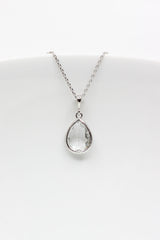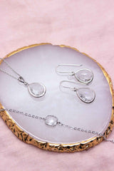 Dieses silberne Schmuckset bezaubert durch seine Schlichtheit. Die Tropfenform der silbernen Ohrhänger verleiht ihnen ein zeitloses Aussehen. Der Kristallanhänger ist an einer feinen silbernen Kette befestigt. Das Set wird durch das zarte Armband mit dem passenden Schmuckstein komplettiert.