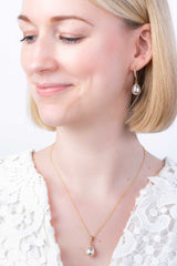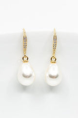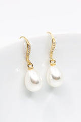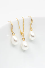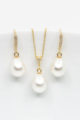 Dieses zeitlose Schmuckset kannst Du perfekt zu vielen Brautoutfits tragen. Die vergoldeten Ohrhänger bezaubern mit ihren tropfenförmigen Perlen durch pure Eleganz. Die zarten Ohrhaken, mit funkelnden kleinen Zirkoniasteinen, machen die Ohrringe zu einem absoluten Blickfang! Der schlichte tropfenförmige Perlenanhänger ist an einer feinen vergoldeten Kette befestigt und bezaubert durch sein elegantes Aussehen.