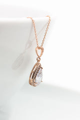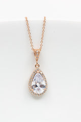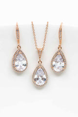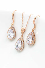 Dieses rosegoldene Schmuckset bezaubert durch pure Eleganz. Die tropfenförmigen Ohrhänger verleihen jedem Outfit ein zeitloses Aussehen. Der funkelnde tropfenförmige Kristallanhänger ist an einer feinen rosegoldenen Kette befestigt und bezaubert durch sein elegantes Design.