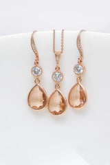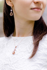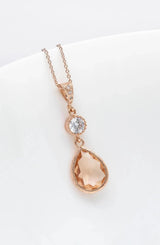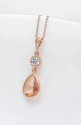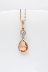 Wunderschöne rosegoldene Kette mit einem pfirsichfarbenen Schmuckstein und einem Zirkoniastein. Die Tropfenform verleiht ihr ein zeitloses Aussehen.