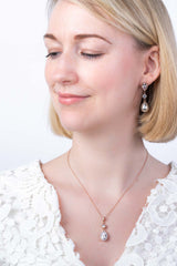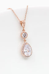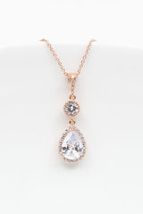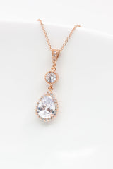 Der lange tropfenförmige Kristallanhänger ist an einer feinen rosegoldenen Kette befestigt und bezaubert durch sein elegantes Design.