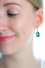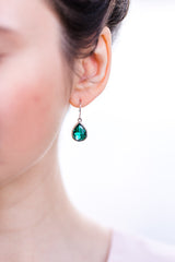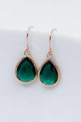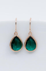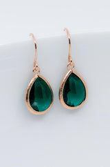 Schlichte rosegoldene Ohrringe mit grünen Steinen.