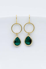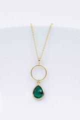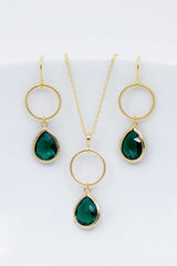 Dieses vergoldete Schmuckset bezaubert durch seine Schlichtheit. Die Tropfenform der grünen Ohrhänger verleiht ihnen ein zeitloses Aussehen. Der tropfenförmige Anhänger ist an einer feinen Kette befestigt.