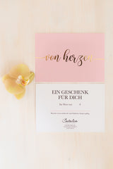 Du liebst die Idee, anderen mit einem Geschenkgutschein eine Freude zu machen, aber möchtest ihn nicht so gern per E-Mail verschicken? Dann haben wir etwas für Dich! Unser Geschenkgutschein ist genau das, wonach es sich anhört - eine hochwertige Geschenkkarte in einem Umschlag, die zum Verschenken bereit ist! Wähle einfach den gewünschten Betrag für den Geschenkgutschein und lege ihn in den Warenkorb. Wenn Du ihn direkt an den Beschenkten senden möchtest, gib unbedingt die Versandadresse ein, damit wir wissen, an wen wir ihn senden sollen. Der Geschenkgutschein wird in einem schützenden Versandumschlag verschickt, damit er und der Umschlag "Von Herzen" nicht beschädigt werden.