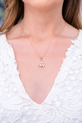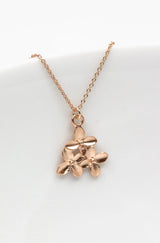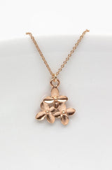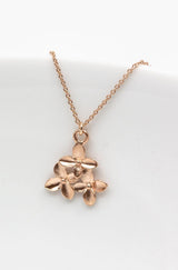 An der feinen rosegoldenen Kette, ist ein Anhänger mit drei zarten Blüten befestigt.