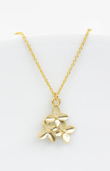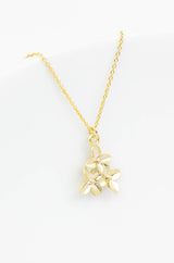 An der feinen goldenen Kette ist ein Anhänger mit drei zarten Blüten befestigt.