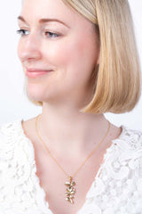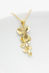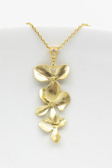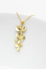 Die vergoldete Halskette zieren drei zarte Blüten, die an einer mit Zirkoniasteinen besetzten Schlaufe befestigt sind.