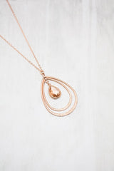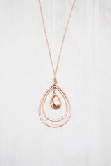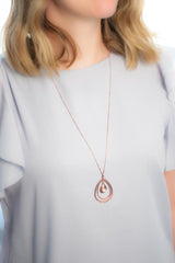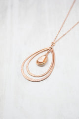 Wunderschöne rosegoldene Kette, mit einem eingerahmten pfirsichfarbenen Schmuckstein. Die untere Seite des Tropfens ziert ein schönes gehämmertes Muster.