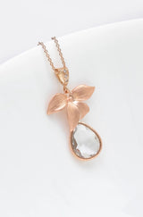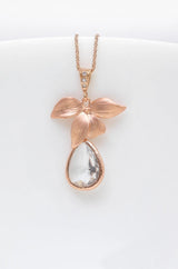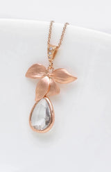Die tropfenförmige Kristallanhänger ist an einer zarten Blüte befestigt, durch den sich eine feine rosegoldene Kette zieht.