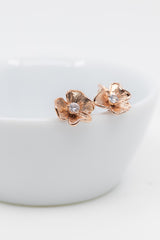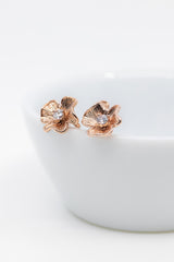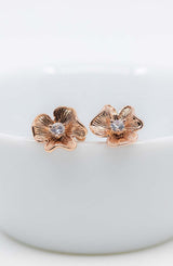 Florale Ohrstecker mit rosegoldenen Blüten und funkelnden Zirkoniasteinen.