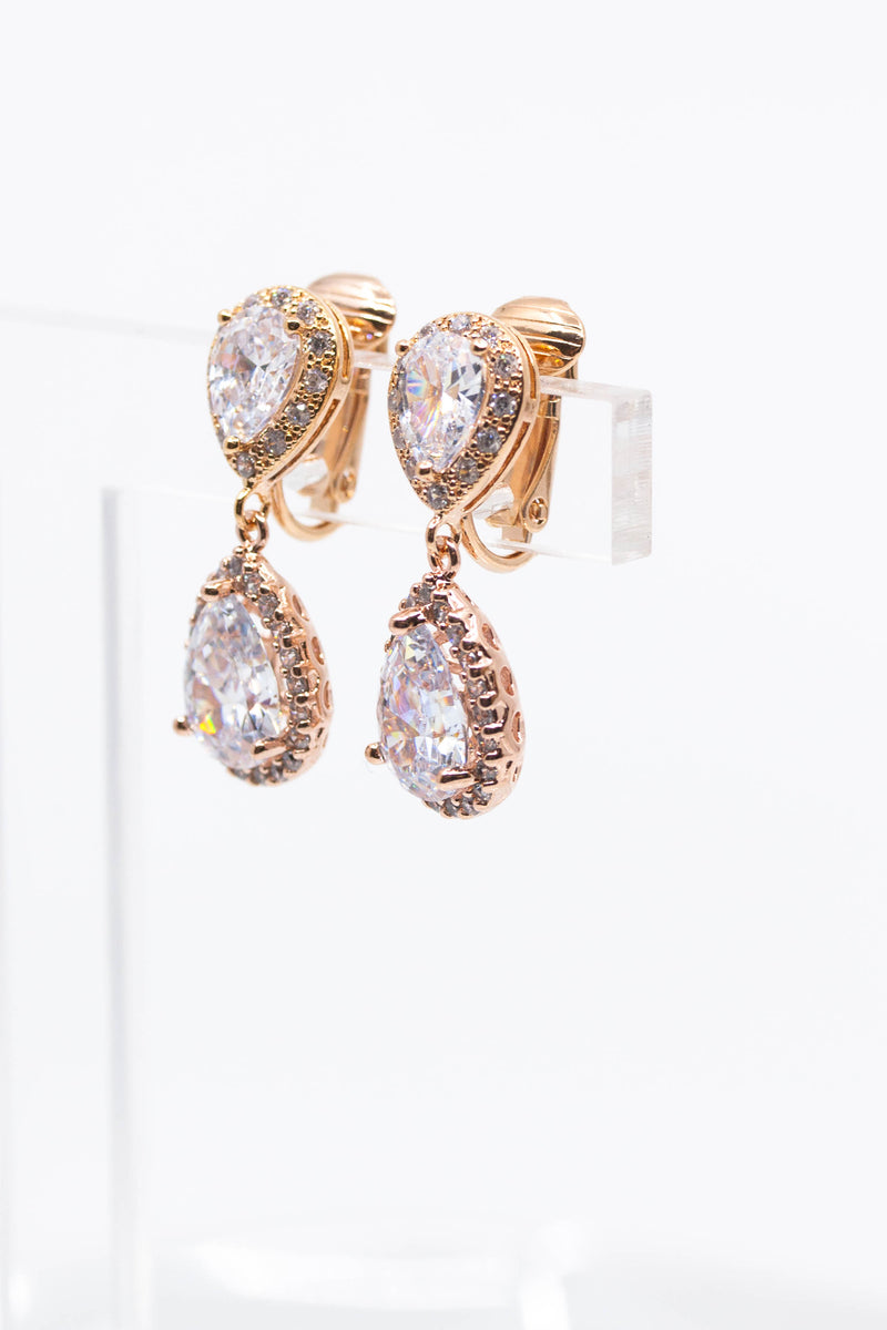 Rosegoldene Ohrringe mit Clipverschluss. Die Zirkonia besetzten Schmucksteinen, in Tropfenform, verleihen ihnen ein zeitloses Aussehen.